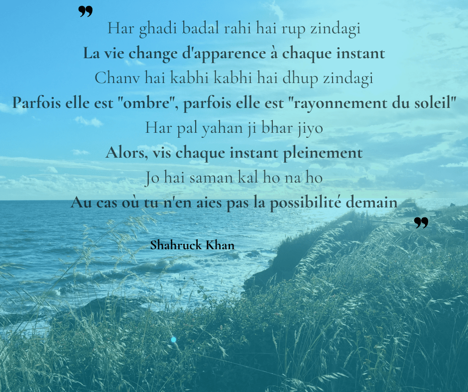 Quelques paroles tirées du film « Kal ho na ho » (Bollywood), dont j’ai eu la curiosité d’aller voir la traduction, une belle trouvaille que je souhaitais vous partager ce soir.